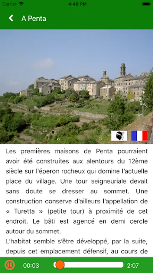 This application allows you to view all the information in the French and Corsican version on various points of interest in the heritage trail of Penta di Casinca.