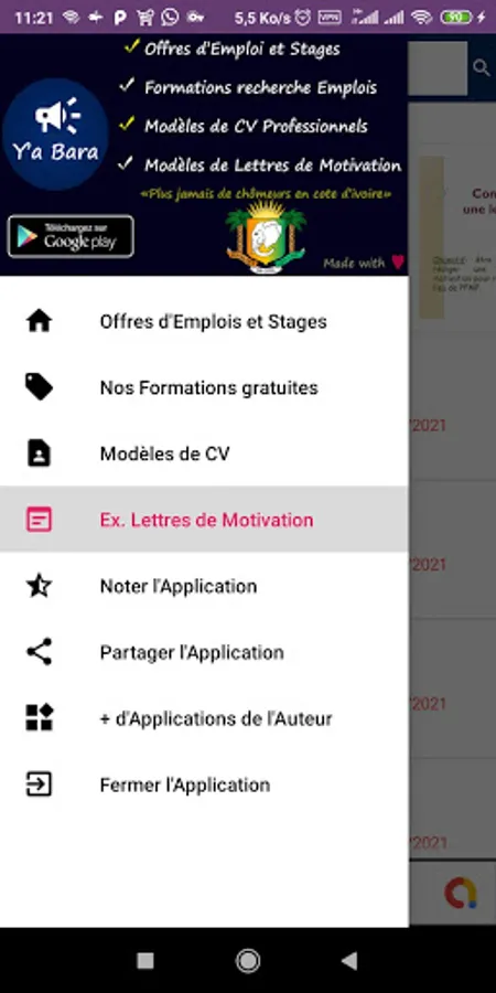 You are looking for jobs or internships in Ivory Coast, you have difficulty applying for job offers you find, you do not know how to create a powerful CV or Cover Letter, Y'a Bara is the app for you.