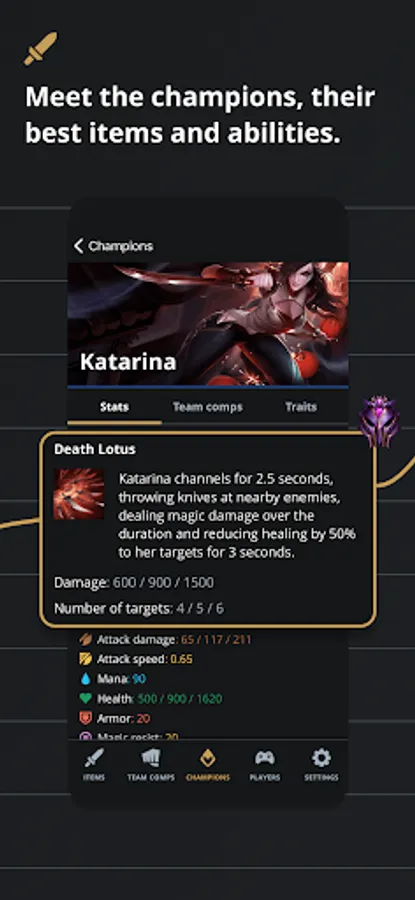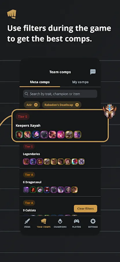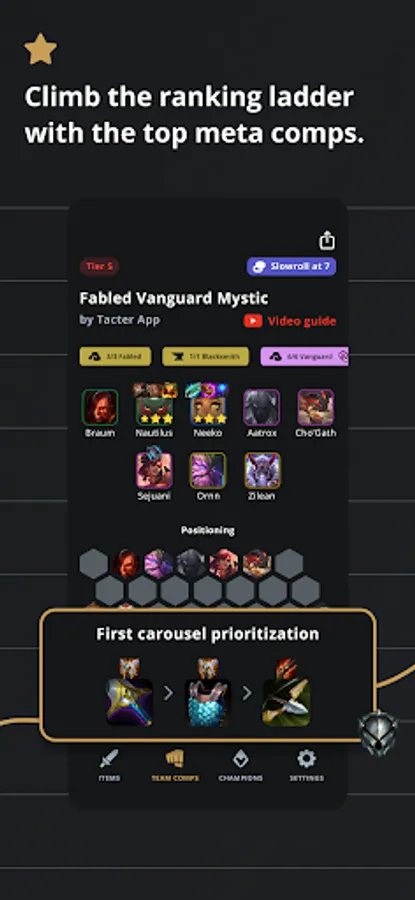 • Create your own TFT compositions and share them with your friends. Plan ahead strategies while playing the game with the composition builder, or theorycraft even if you’re not playing.