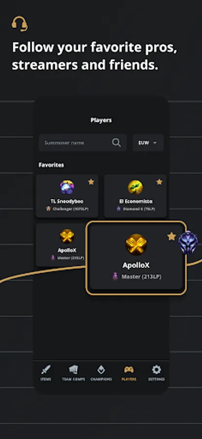 • Keep track of the rank of your friends and favourite streamer Riot Games summoners.