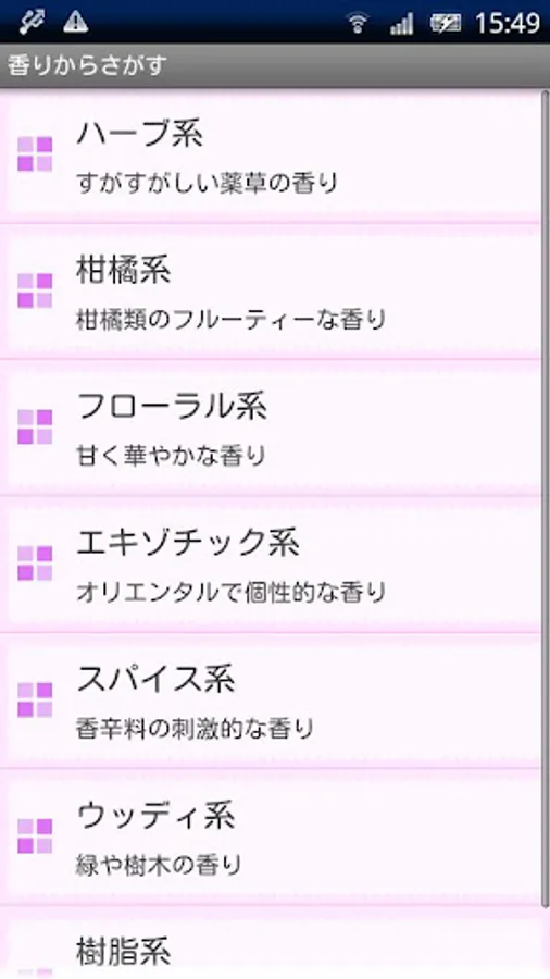 This app "aroma BOOK" or looking for the aroma from favorite scent, current, or search for a good compatibility with the essential oil from the aroma name for which you have, and you can search the aroma to meet in symptoms from efficacy, Ya own purposes method suitable for the preference or,, bus, massage, aroma, inhalation, and how to incorporate into the body, such as coating and compress, describes an easy-to-understand easily.
