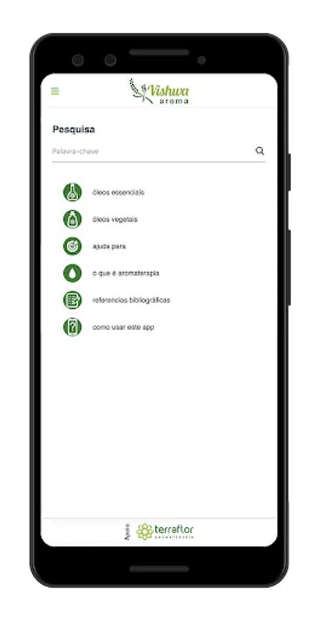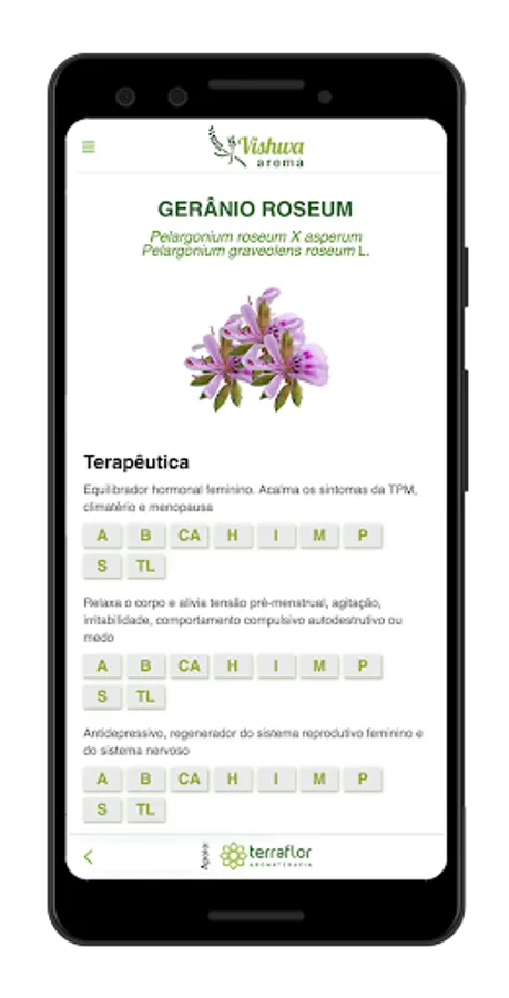 The app's texts were written by Vishwa Schoppan, a biologist with a bachelor's degree in ecology. Graduated in aromatherapy from L'ecole de Santé Francaise-Graveson-Provence, in Ayurvedic Massage Training by Kussum Modak, India, with extension in Ayurveda with Dr. Danilo Carneiro by the Brazilian Association of Ayurveda, trained in Aura-Soma Color Therapy and courses in phytotherapy extension. Owner and Technical Responsible of Terra Flor Aromatherapy.