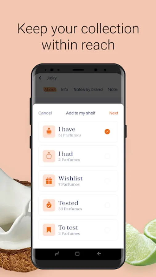 Create different lists of perfumes: I have / I had / Wishlist / Tested / To test.