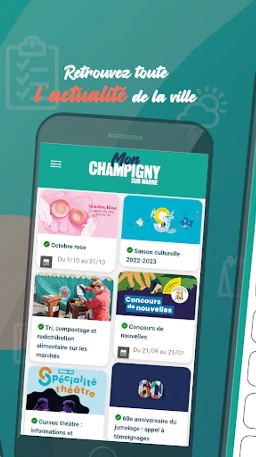 News and practical information, reports of problems, administrative procedures and appointments, transport timetables, calendar of events: make your life easier thanks to My Champigny, the official application of the City of Champigny-sur-Marne.