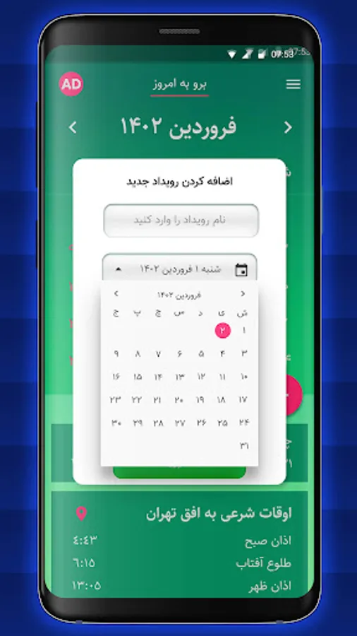 Features of Persian calendar program 1402 - call to prayer and qibla display, event registration