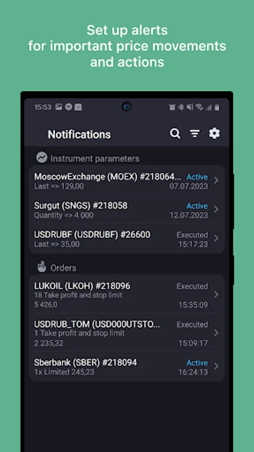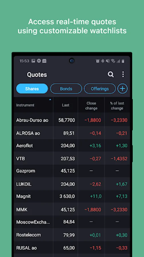 - Monitoring of current financial instruments quotes with possibility to customize a watchlist,
