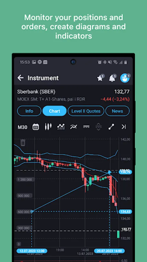 - Monitoring of trade dynamics with charts, including technical analysis indicators,
