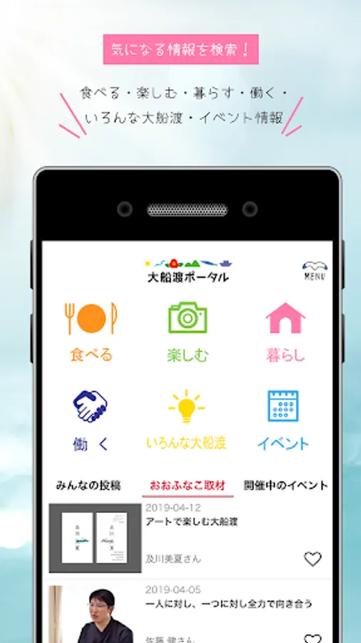 1.食べる/楽しむ/暮らす/働く/いろんな大船渡/イベント情報 から、検索することができます。オオフナコが取材した基本情報には取材済スタンプが!すべて無料で見放題!