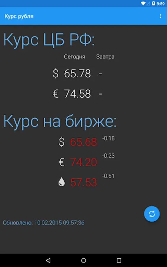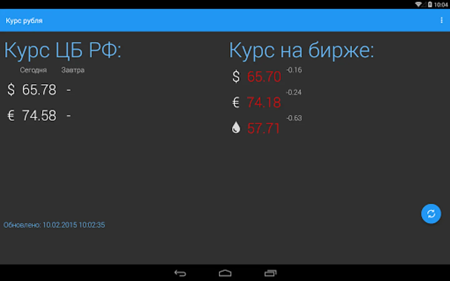 ruble exchange rate are updated automatically when you start the application and when you click on the update button. In the absence of an internet connection you will see the downloaded last time exchange rates.