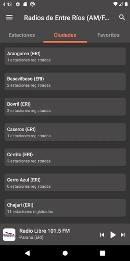 Radios from Paraná, "Concordia", "Gualeguaychú", "Concepción del Uruguay", "Gualeguay", "Villaguay", "Victoria", "Chajarí" and many other cities from Entrerrianas.