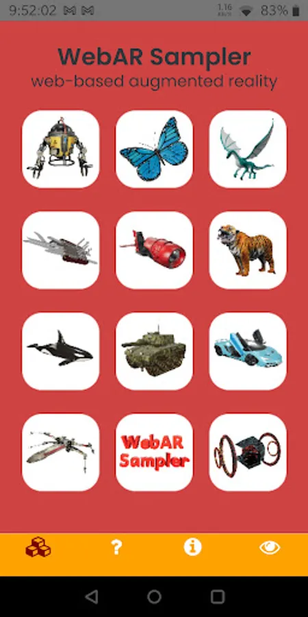 Try augmented reality content including robot drone, butterfly, green dragon, army knife, hover bike, Bengal tiger, orca whale, army tank, sports car, x-wing fighter, AR text and spaceship ion drive. Learn: What is web-based augmented reality? And how webAR functions.