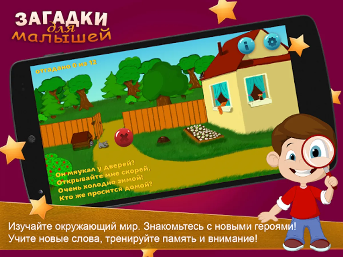 Listen to the riddle with your child or read it yourself by turning off your voice in the settings. Look for the answer on the screen and press your finger to check the answer. The answer is a hidden object.