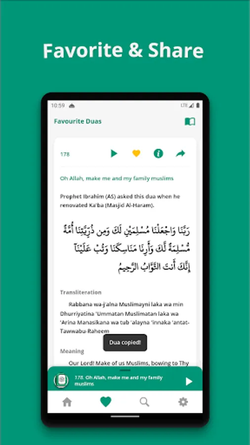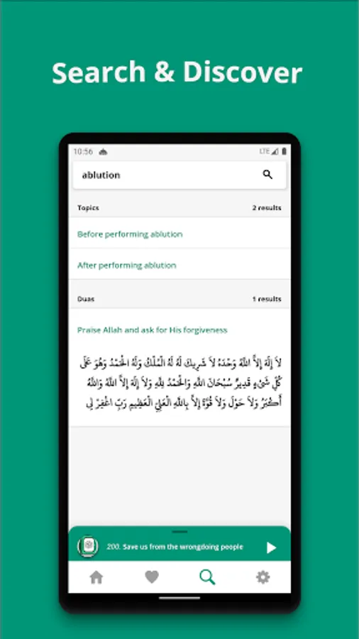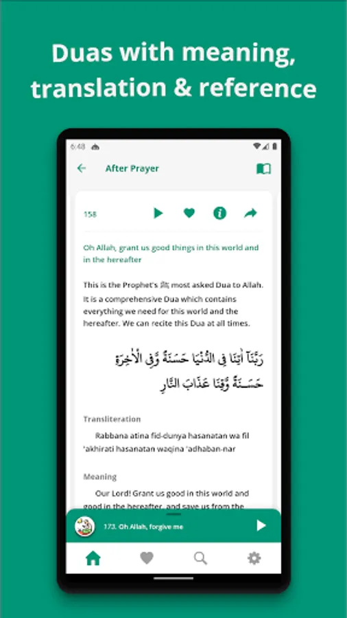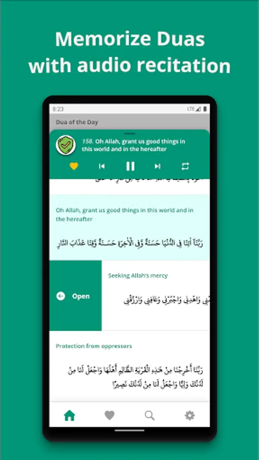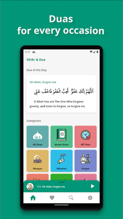 Dhikr & Dua is a collection of 262 authentic Duas from holy Quran and Sunnah. The app has a simple, and elegant design with audio recitation, favorites, categories, Dua of the day, search and share Duas.