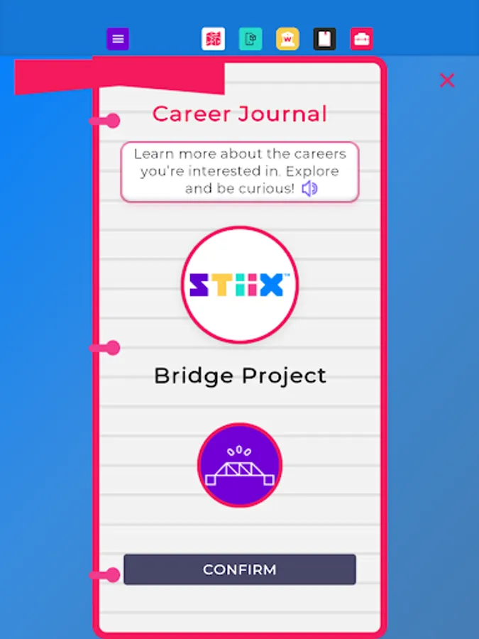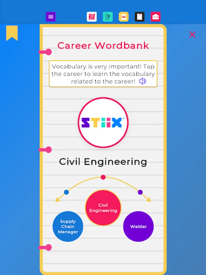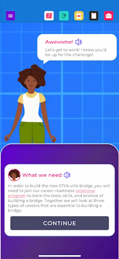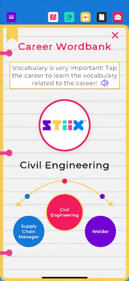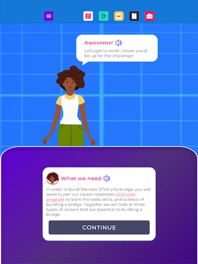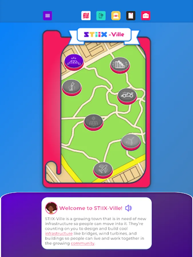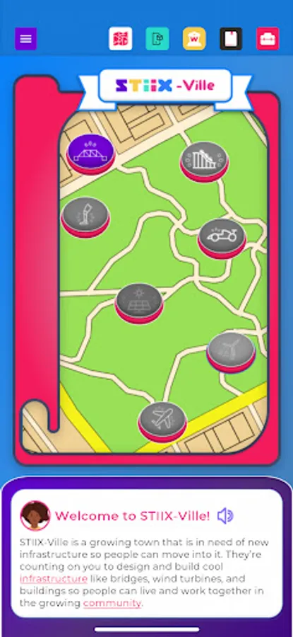 Welcome to STIIX-ville! Throughout this application, you will be immersed as an engineering apprentice to learn about STEM education as well as all kinds of careers related to engineering and other technical professions. Choose from our diverse selection of mentors to guide you around the modules, bring tools to life in augmented reality, and complete engaging activities to sharpen your career skills. Upon completion, you will become STIIX-ville's Chief Engineer to ensure the town has all the required infrastructure for future growth and expansion, plus a personalized Career Journal!