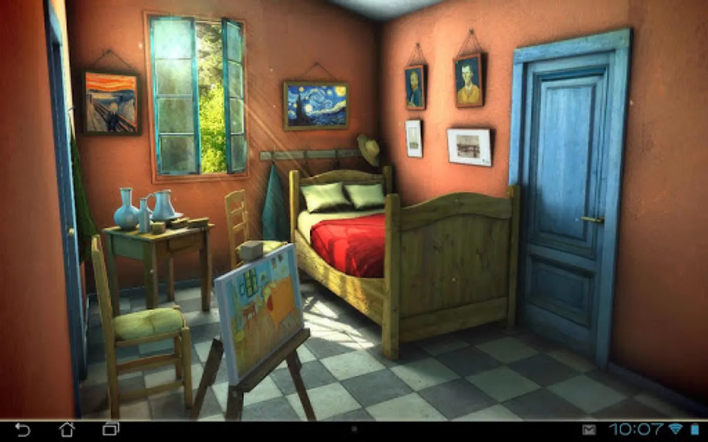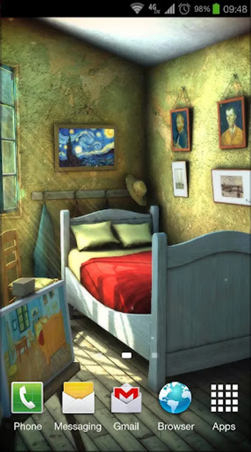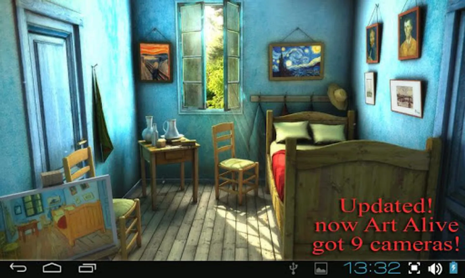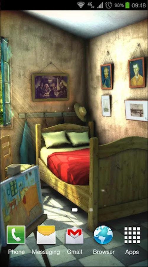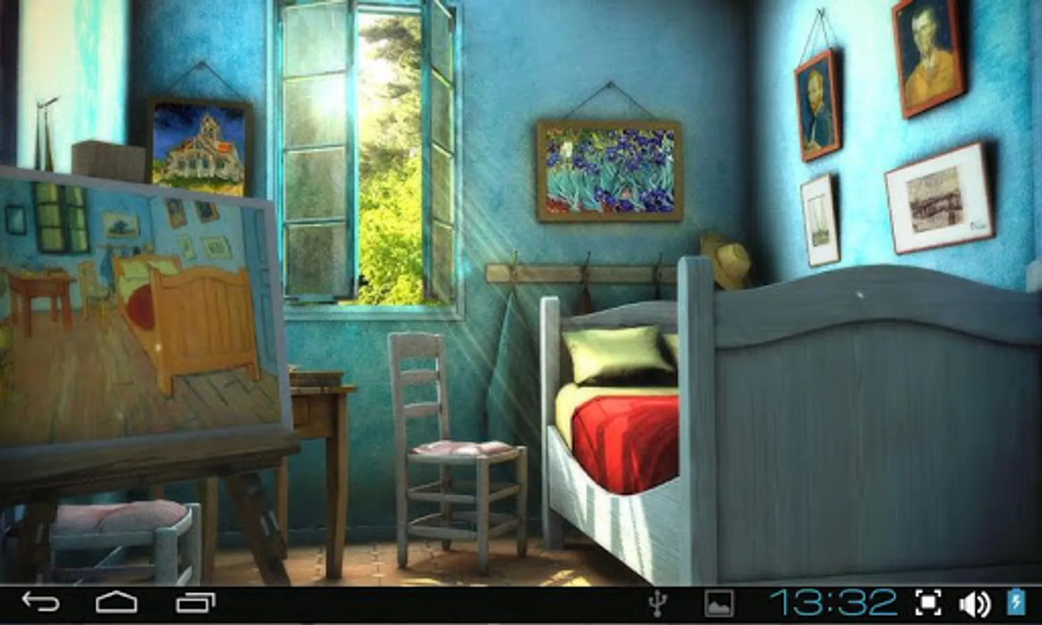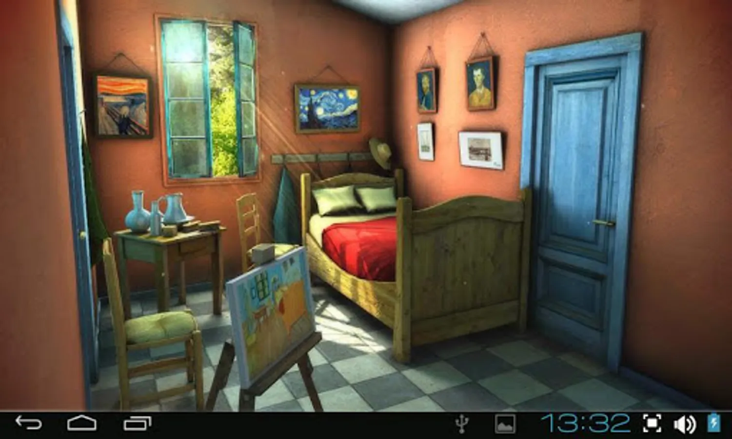 The most amazing photo realistic art 3D live wallpaper at Google Play for your phone or tablet! One of the most famous paintings in the world "Bedroom in Arles" of Vincent van Gogh re-created in full 3d will give artistic colorful look to your phone screen! The visual is extremely realistic, so you will feel what you are standing in the middle of the room! This live wallpaper is loaded with great amount of customization options, you can change paintings( most of them by van Gogh), walls, floor or furniture materials. So you can by yourself to design your own van Gogh room, every combination will look just amazing and artistic!