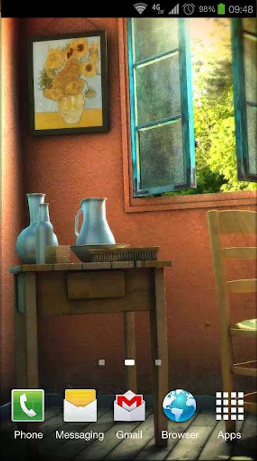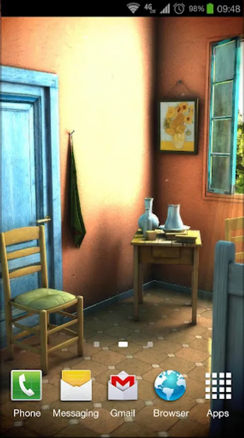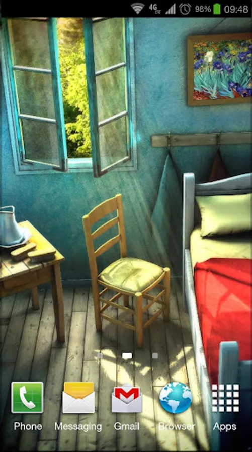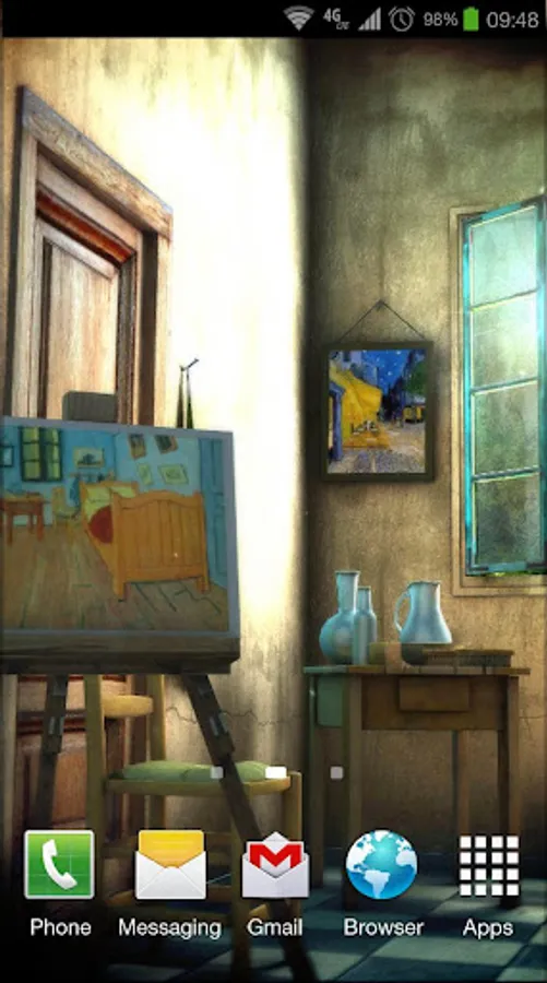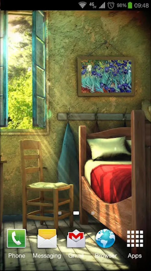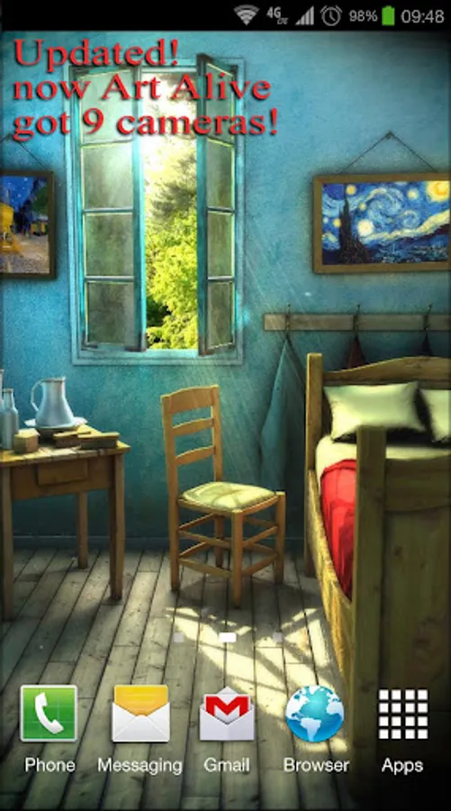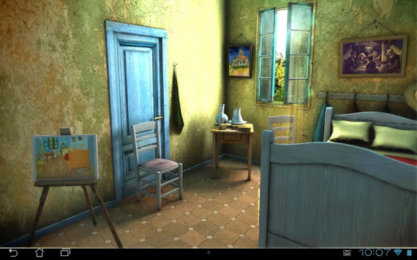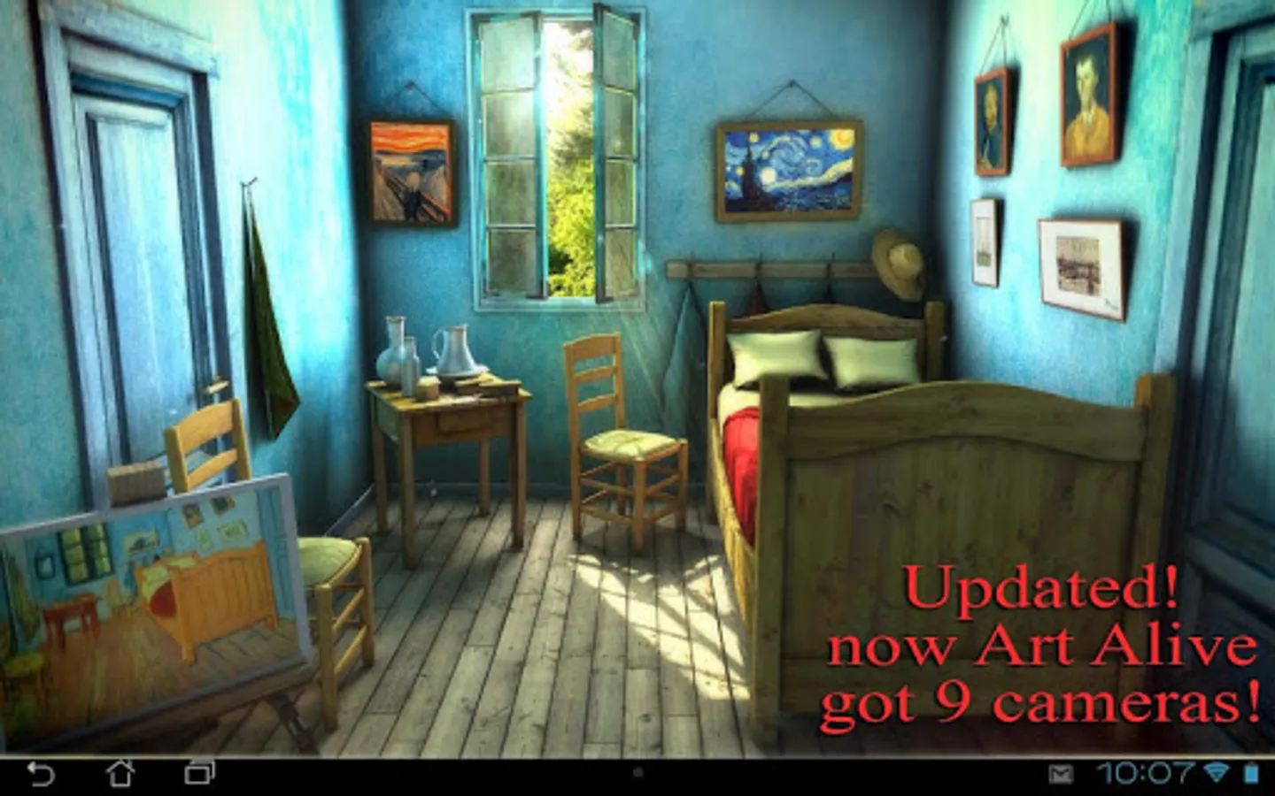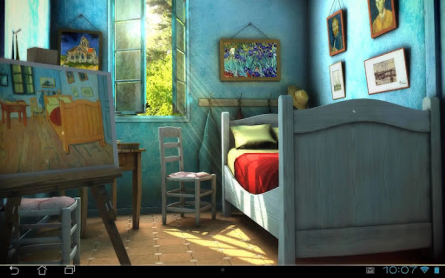 The most amazing photo realistic art 3D live wallpaper at Google Play for your phone or tablet! One of the most famous paintings in the world "Bedroom in Arles" of Vincent van Gogh re-created in full 3d will give artistic colorful look to your phone screen! The visual is extremely realistic, so you will feel what you are standing in the middle of the room! This live wallpaper is loaded with great amount of customization options, you can change paintings( most of them by van Gogh), walls, floor or furniture materials. So you can by yourself to design your own van Gogh room, every combination will look just amazing and artistic!