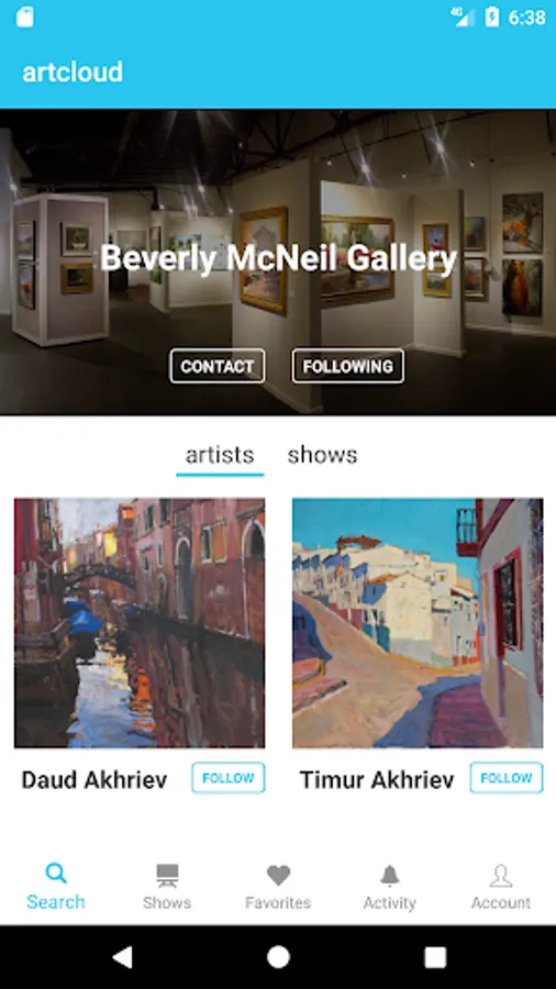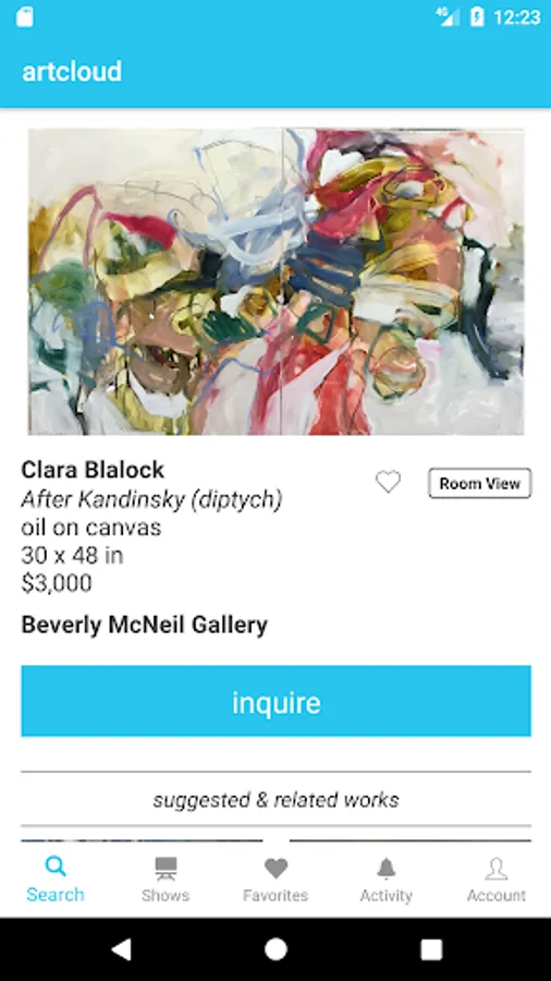 access artcloud’s marketplace which hosts thousands of global galleries. Browse their collections and follow your favorite galleries to stay up-to-date on their latest inventory. Localize your search and connect with galleries in your current location to inquire on a piece, or schedule an appointment.