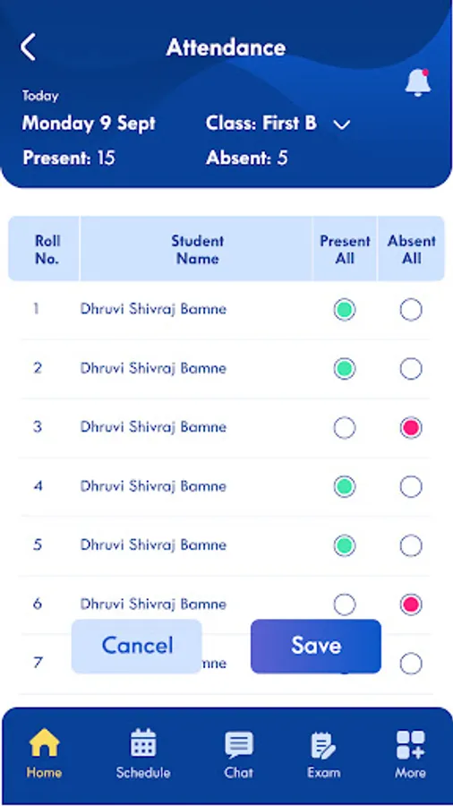 Teachers can record attendance in a few seconds and generate reports with just a few clicks. It also intimates parents in real-time about the wards where an automated process helps reduce the possibility of any human error. Teacherrs can also record their attendence through this app and apply for leave to.