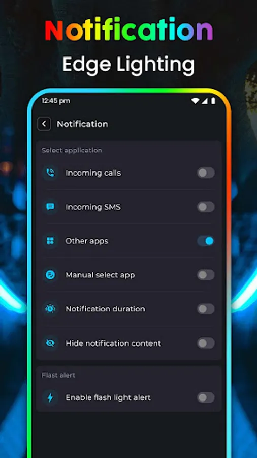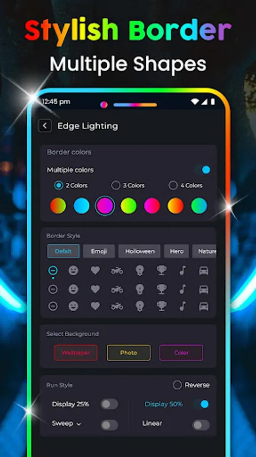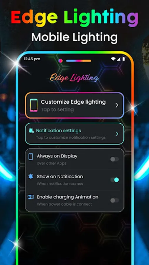 Open Borders light wallpapers & customize Magical Border lighting and beautiful curved rounded corners light. When colorful led lights - LED Notification Light opens then on the main Edge screen light you will see options for enabling the edge lighting borderlight live Wallpaper. Enable led color lights effects and Magical Edge Lightening on your screen and enjoy lighting edge notification color with live wallpaper.