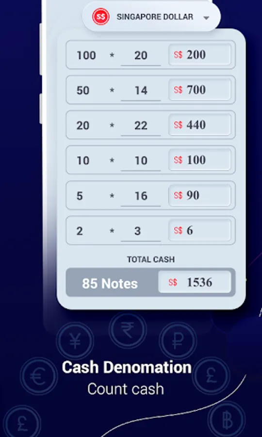 Also along with this you get cash counter for notes. Just enter number of notes in denomination box to count the total amount. Also you can get cash counter for different currencies like - Indian Rupees, American Dollars, Euro, Sigaporean Dollar, Saudi Riyal, Pound, Russian Rubal, etc,.