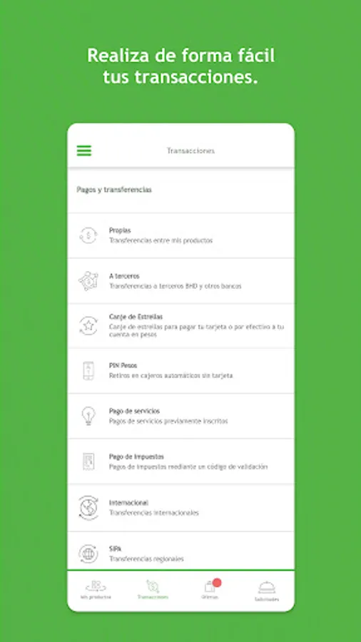 Quick consultation, transactions to other banks, Star redemption, cash transfers with PinPesos, quick login (fingerprint, pattern, PIN), adding transactions, paying services and taxes, customizing products, improving the consultation of all products, among others.