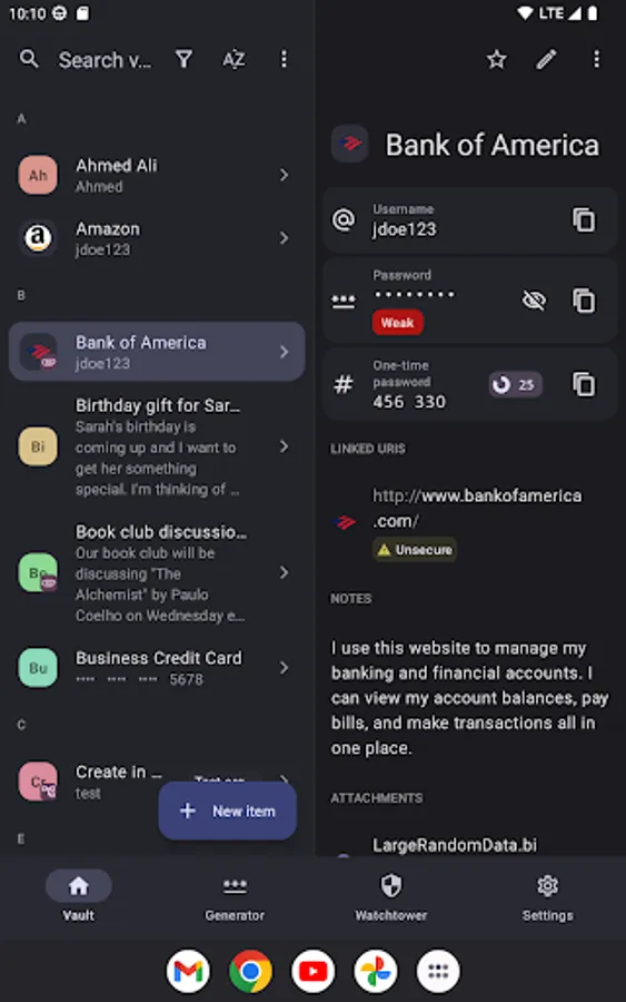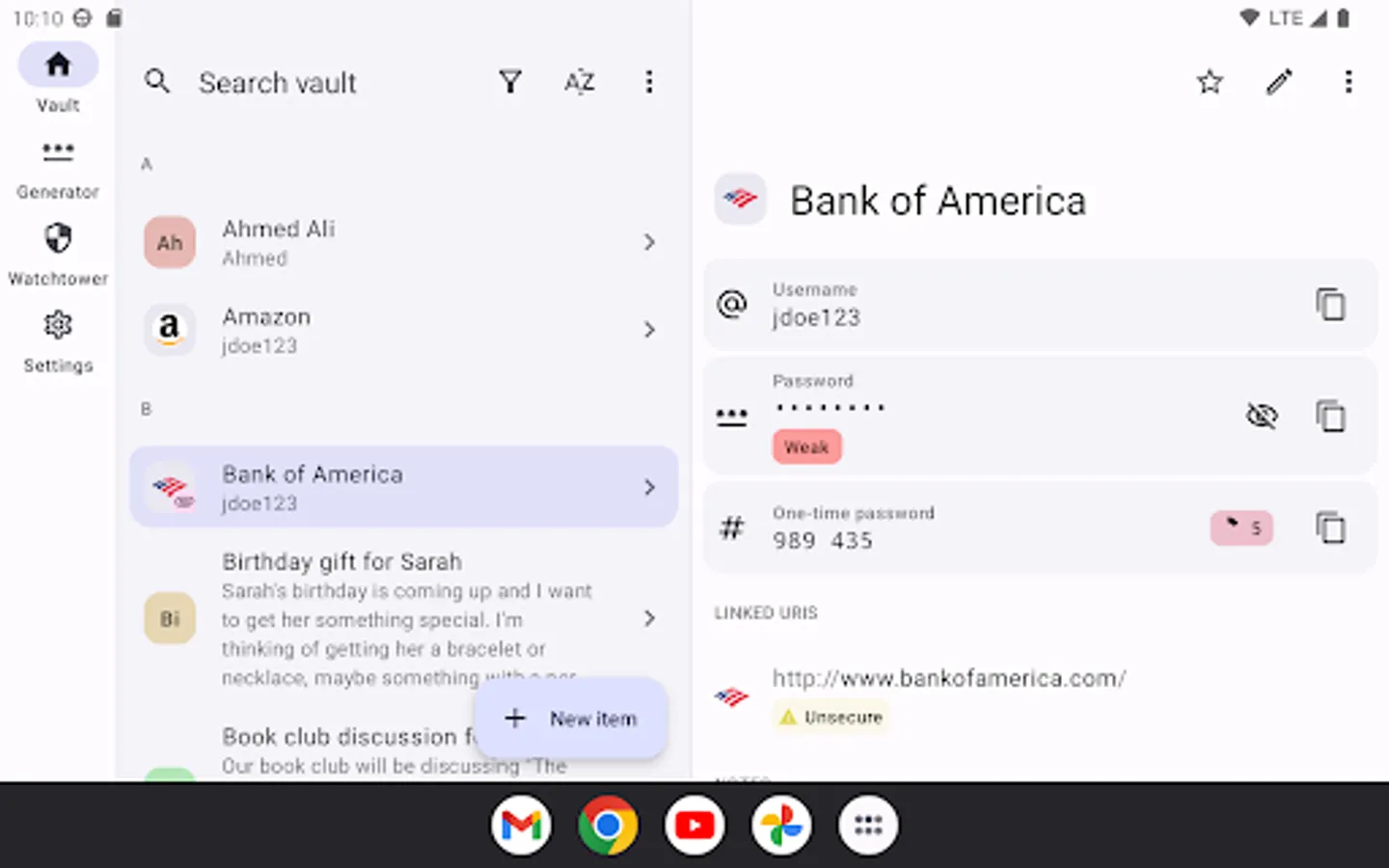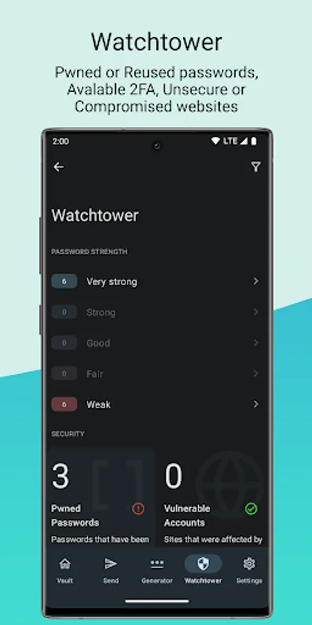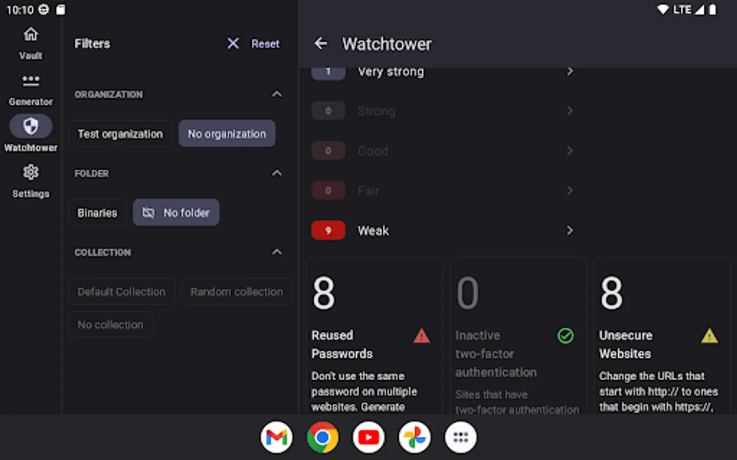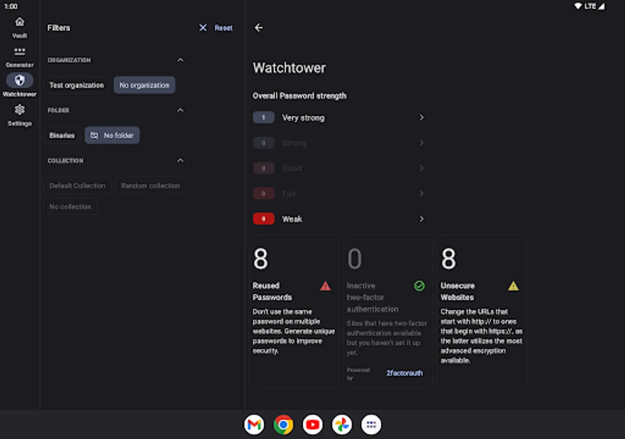 • A watchtower that finds items with Reused passwords, Inactive two factor authentication, Unsecure Websites as well as Duplicate, Incomplete and Expiring items.