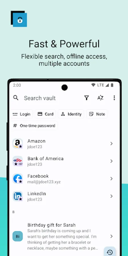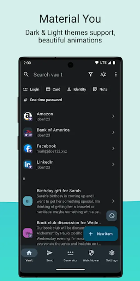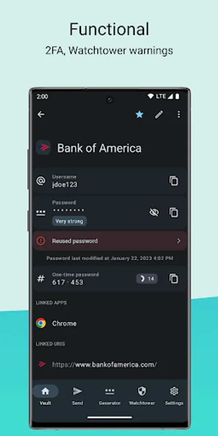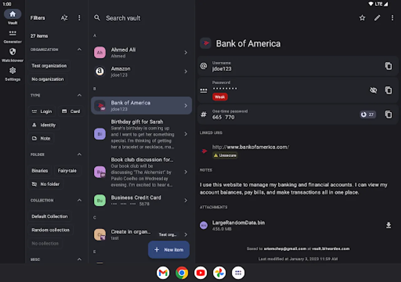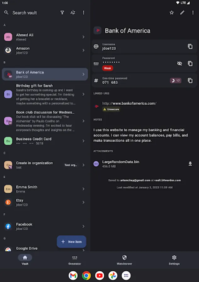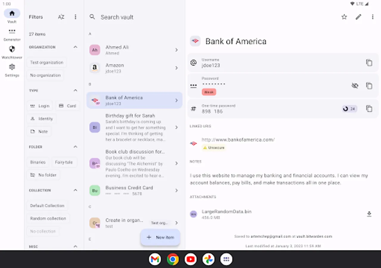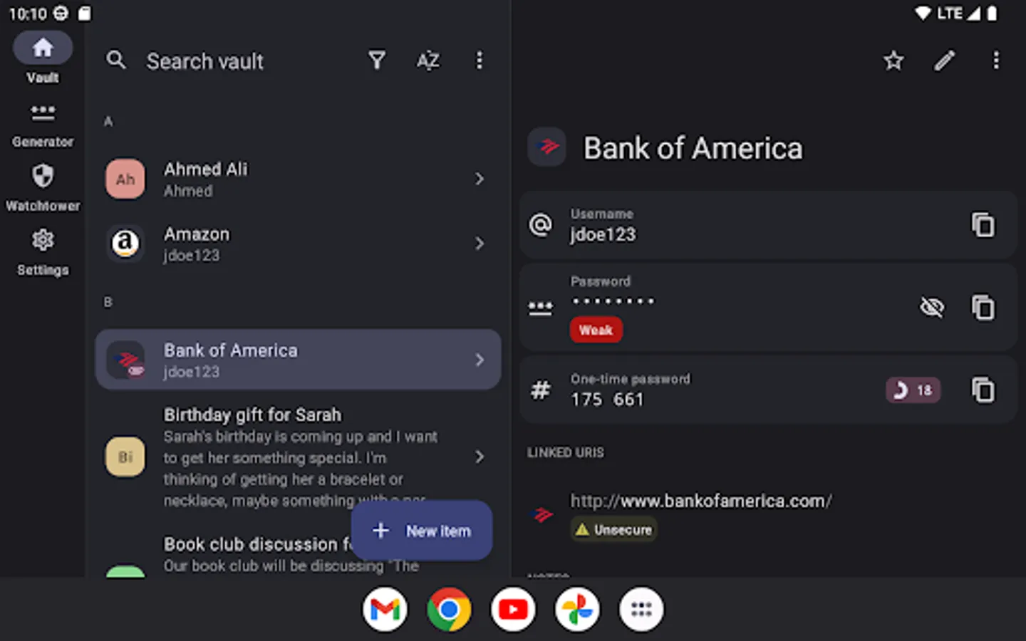 • A watchtower that finds items with Reused passwords, Inactive two factor authentication, Unsecure Websites as well as Duplicate, Incomplete and Expiring items.