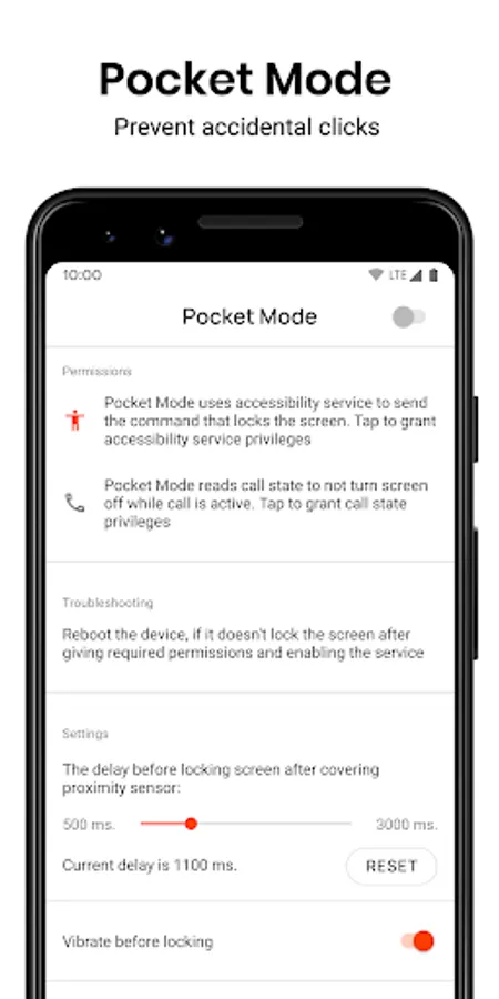 - Accessibility service -- Pocket Mode uses accessibility service to send the command that locks the screen. Without it locking the screen would require a PIN code on each unlock, ruining the user experience.
