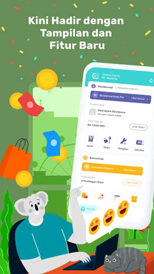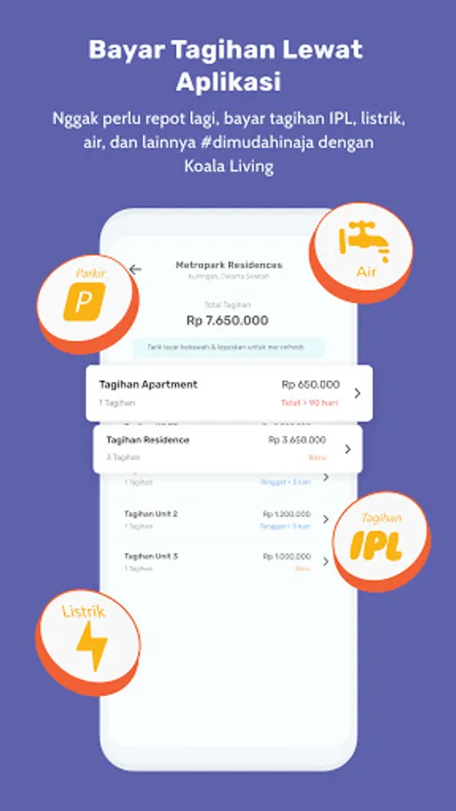 - Pilih hunianmu di Residensial Koala Pro untuk menikmati fitur pembayaran IPL, air, pembelian token listrik*), parkir, ajukan keluhan, dan lain-lain dengan praktis lewat aplikasi.
