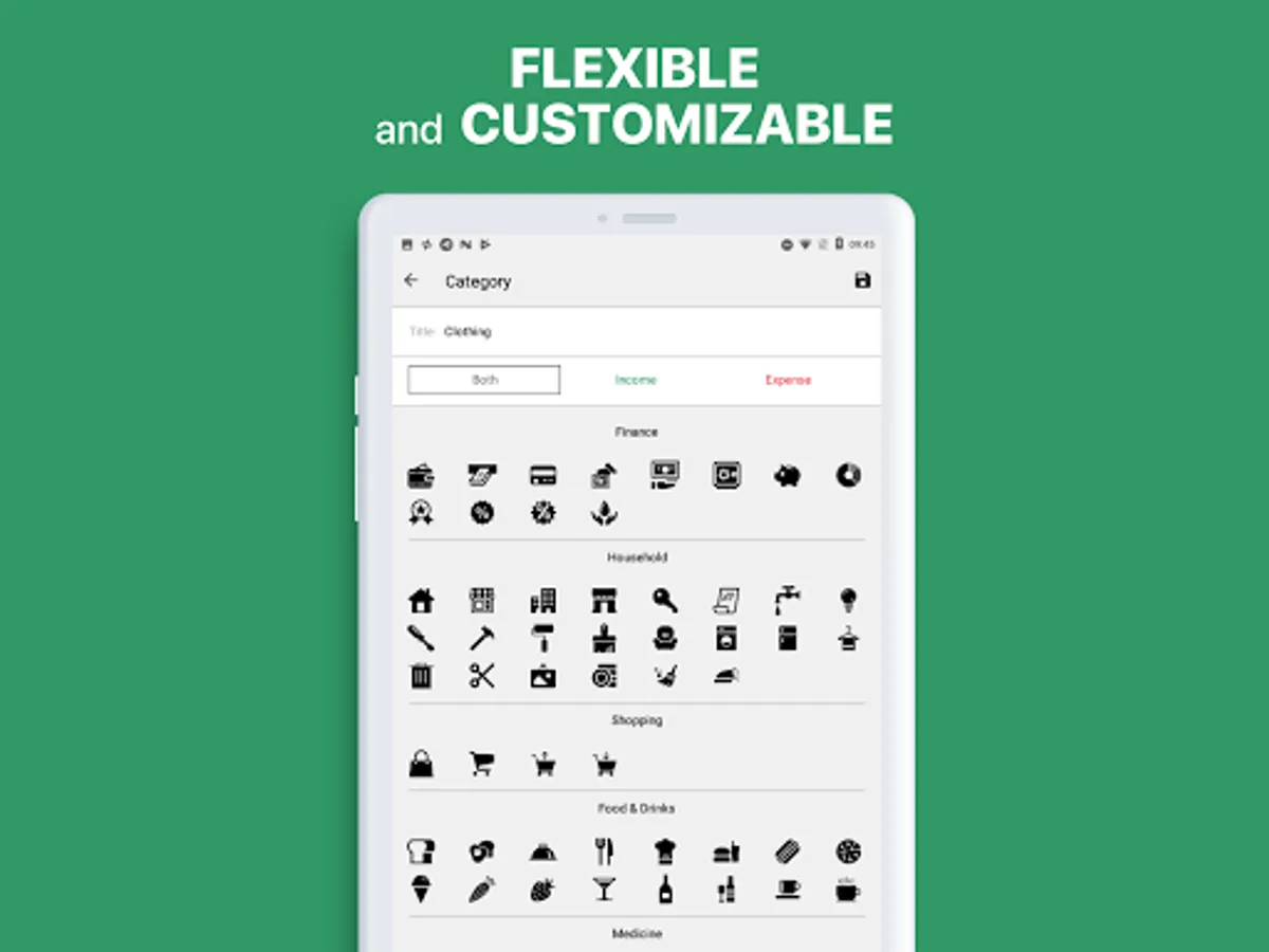 • The app contains more than 25 pre-installed income and expenses categories. You can change, delete, or add new categories to customize them in a convenient way
