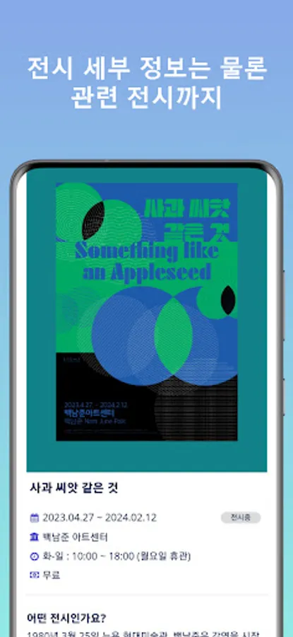 - In the exhibition details, you can easily check information such as period and location, tap a tag to find similar exhibitions, or explore exhibitions worth seeing together in the area around the location with a map view.