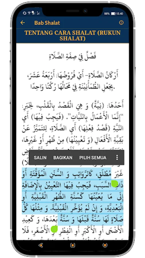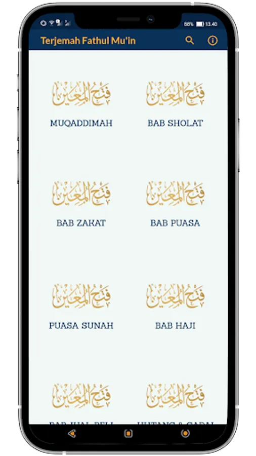 This application for translating the book of Fathul Mu'in is a yellow book reading application that contains a translation of the book of fiqh (fiqh idol) entitled Fathul Mu'in. Fathul Mu'in is one of the books of the salaf (the yellow book) that is studied in the "middle class" majority of Islamic boarding schools in Indonesia. This book by Shaykh Zainuddin bin Abdul Aziz al Malibari explores fiqh.