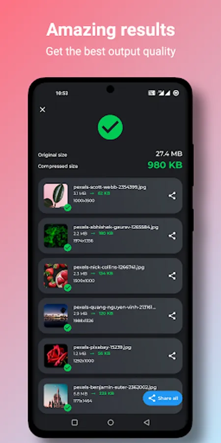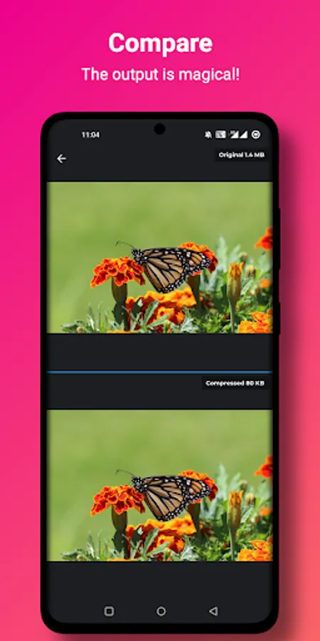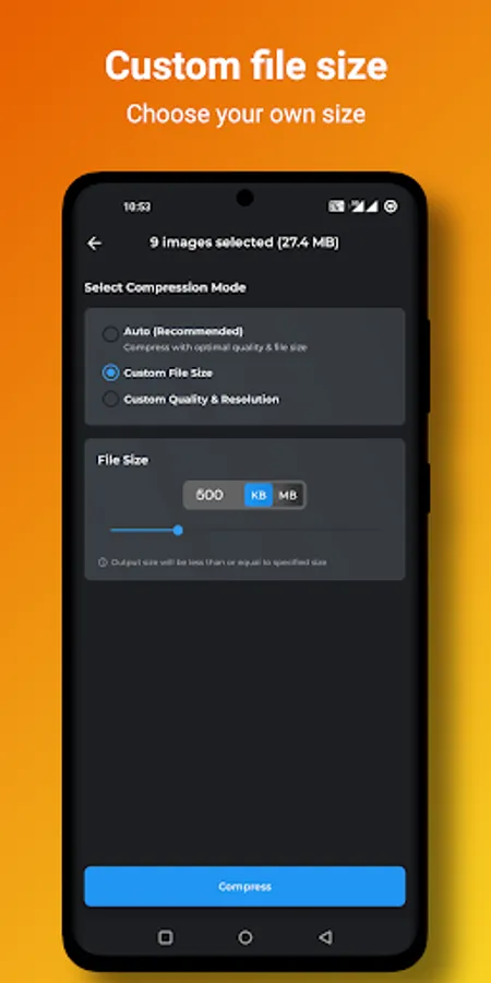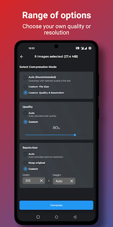 The app supports all major image formats including JPG, JPEG, PNG, and more. You can easily switch between formats to achieve the best compression results. Plus, the app features an auto-compress option that automatically decides the best resolution and quality of the output based on the input image. This saves you the hassle of manual adjustments and ensures optimal results every time.