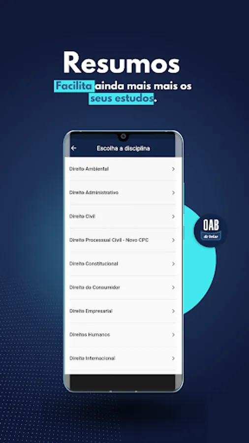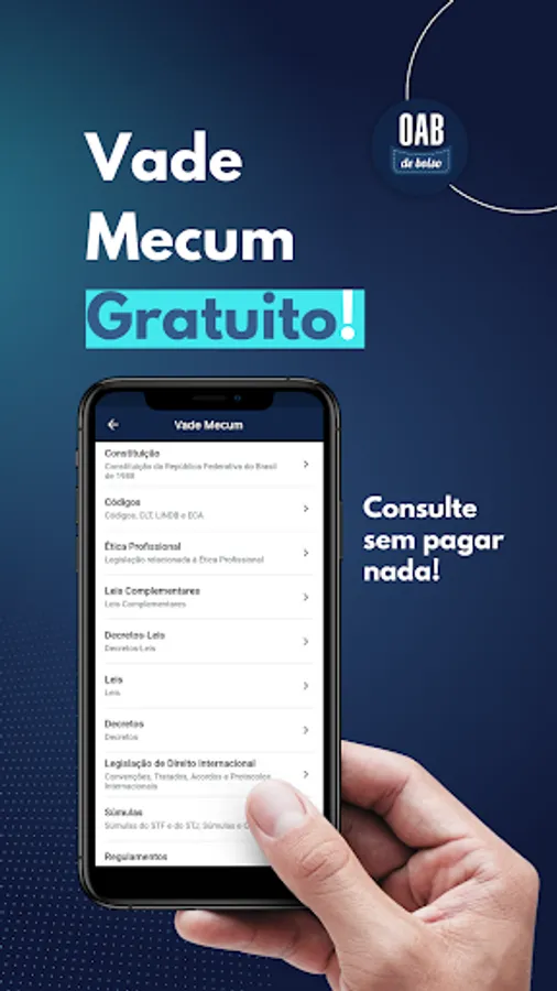 A Vade Mecum (digital legislation) complete with textual search support for laws so you can make queries and clear your doubts. Vade Mecum containing all the articles (law) necessary for you to answer all questions and simulated past OAB exams.