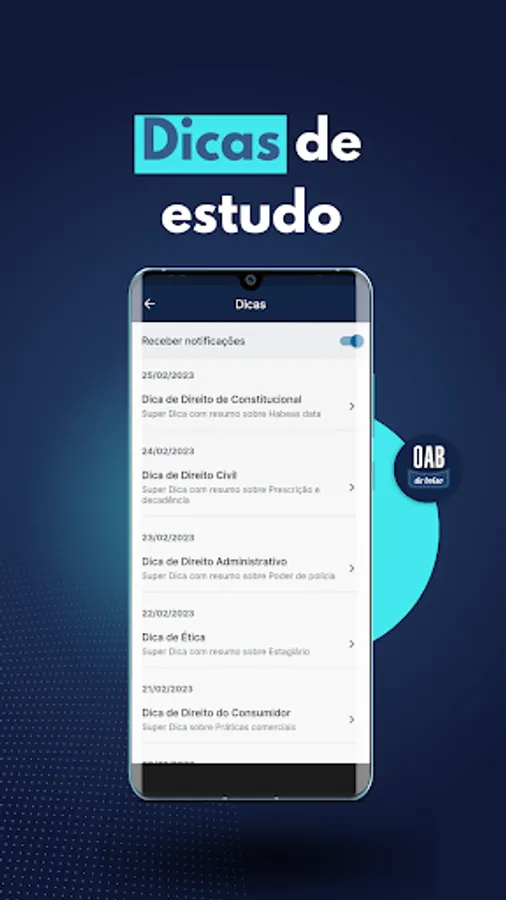 - Receive daily tips on the most charged subjects in the OAB with commented questions to solve, legislation (laws) and summaries to study;