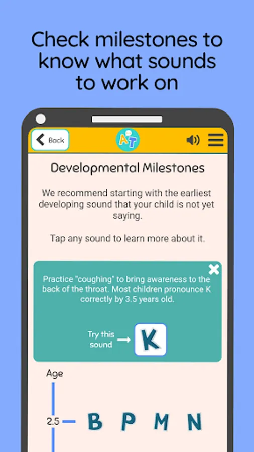 With Articulation Teacher, you choose specific sounds to work on with your child. You can work on early sounds like D or T, intermediate sounds like G or S, or advanced sounds like L or R.