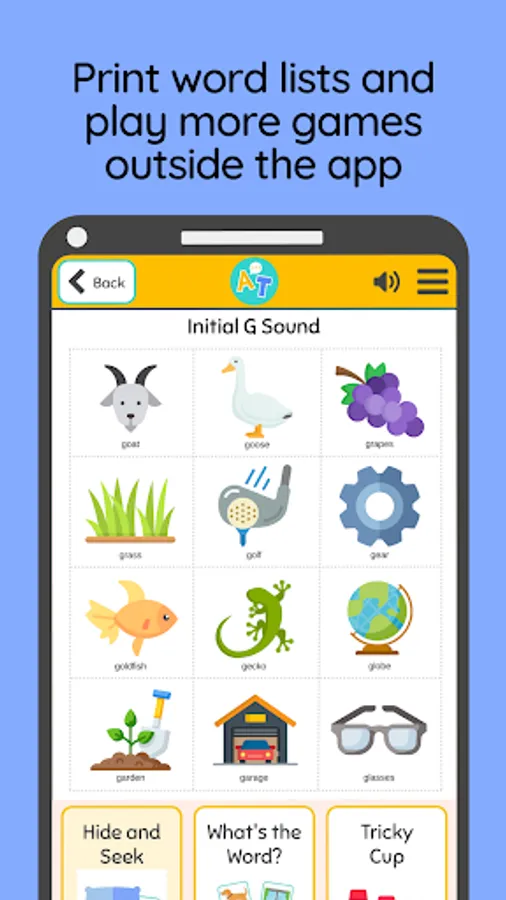 Name It!: our simplest game, this is meant for rapidly trying to say different words using digital flash cards. Swipe to the next word and help your child say it out loud.