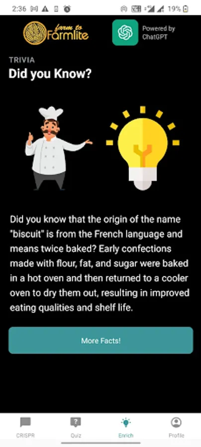 Farm2Farmlite is a comprehensive mobile application that combines cutting-edge technology with industry-specific content to empower biscuit manufacturing professionals at ITC. This application serves as a one-stop solution, equipping users with the tools they need to enhance their skills, clarify doubts, expand their knowledge, and track their progress.