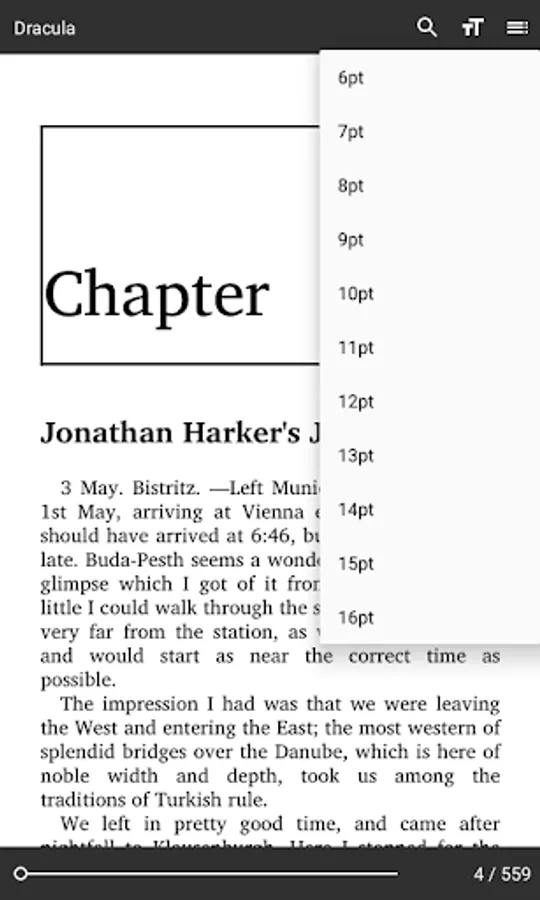 The toolbar also has a search button, a text size button (to set the text size in EPUB and FB2 documents), a zoom button (to toggle between fit page and fit width in PDF documents), and a table of contents button.
