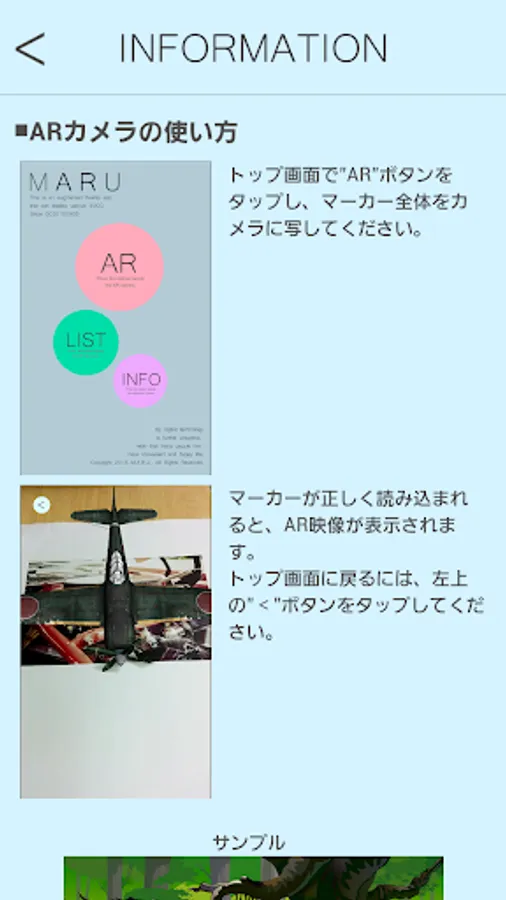 専用マーカーにカメラをかざすとARで3DCGや動画、2次元の画像が立体的に動き出します。