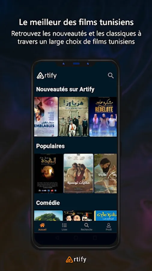 Artify is the first streaming platform specialized in Tunisian cinema, operating legally and respecting copyright laws. The platform features the largest catalog of Tunisian productions, including both new releases and classics, offering a wide selection available with subtitles and in High-Definition.