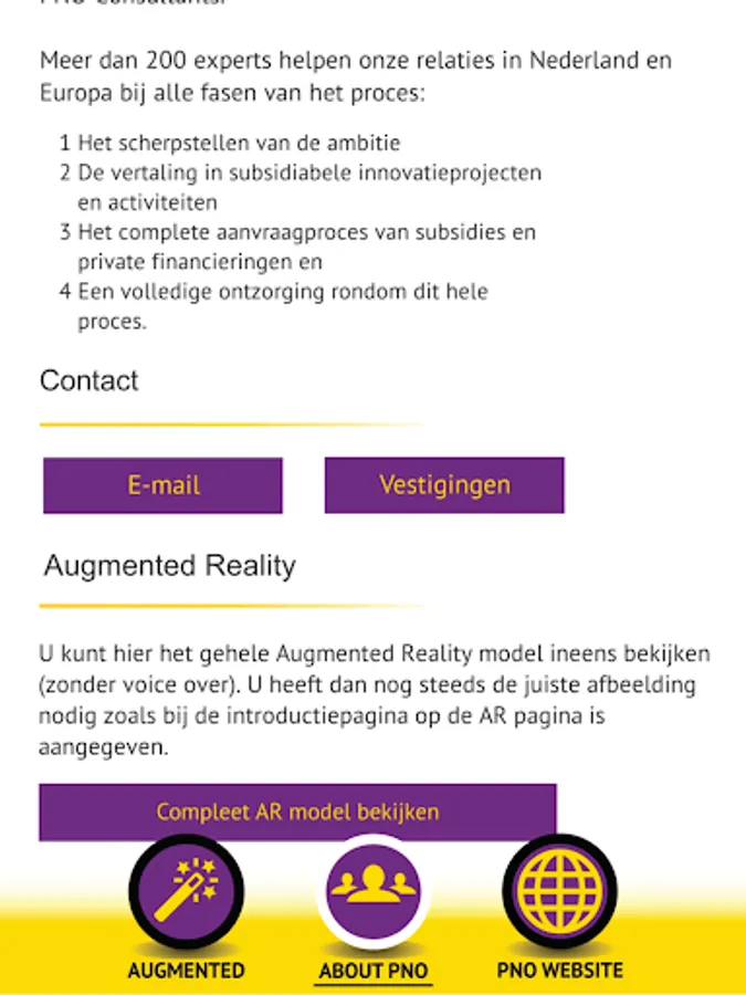 The route from ambition to achievement is always exciting. Especially when that path is made in 3D. This augmented app PNO Consultants you go through in an inspiring way, the path that each entrepreneur. Set your goals, translate it into concrete plans, ensure that adequate funding and grants and realize your ambitions.