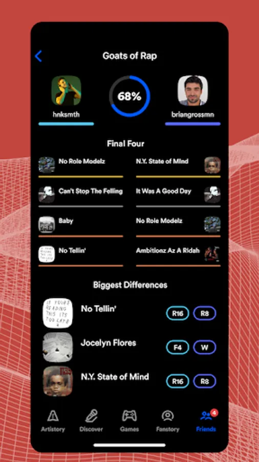 Compare your fan profile with your friends to see your compatibility and find your next favorite artist.