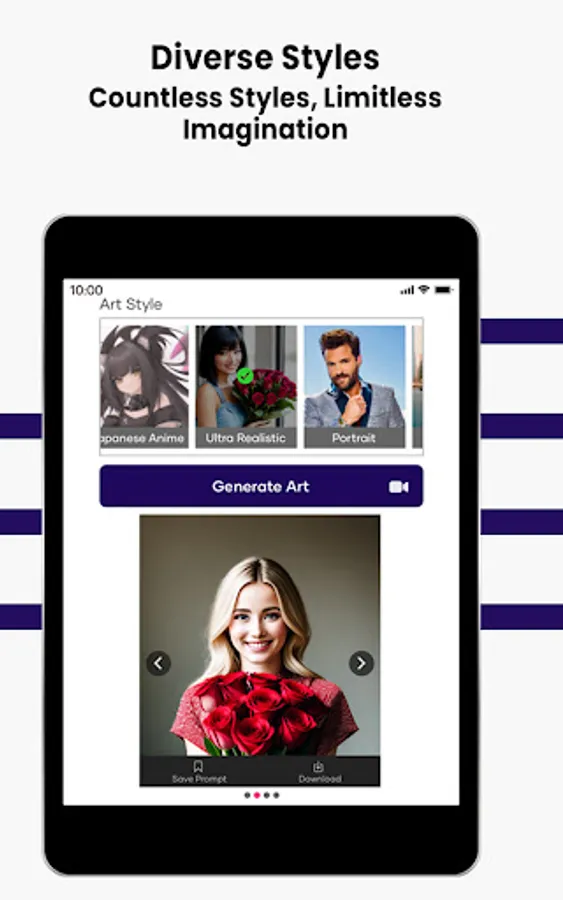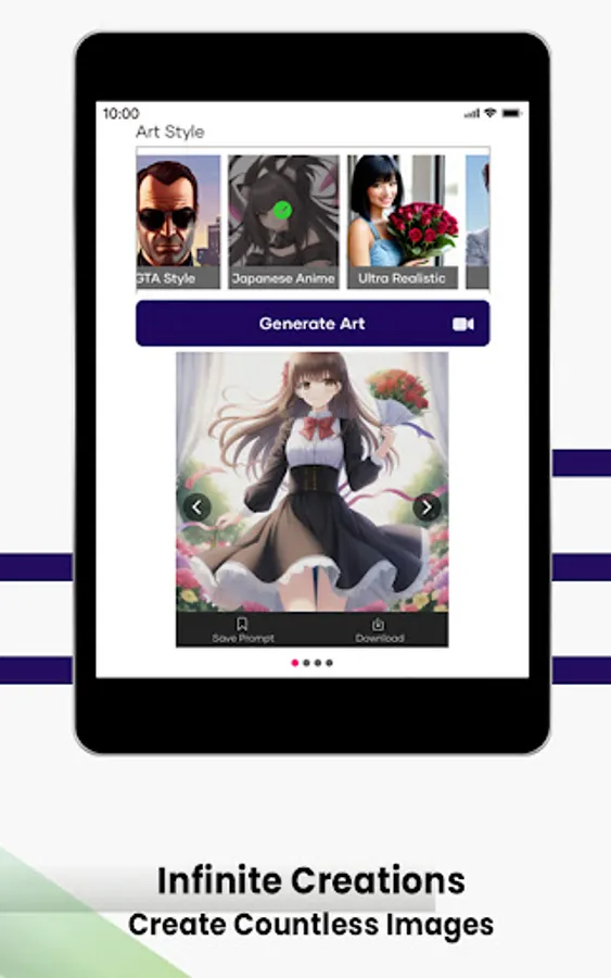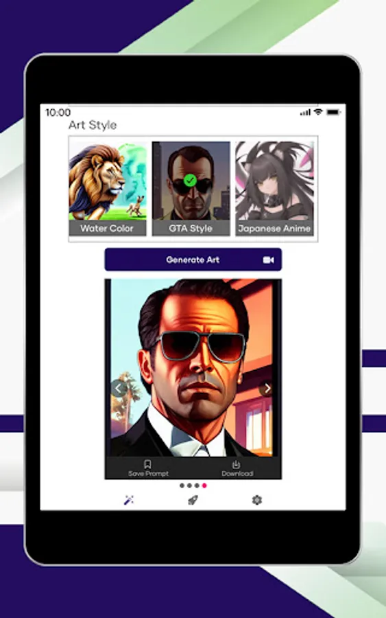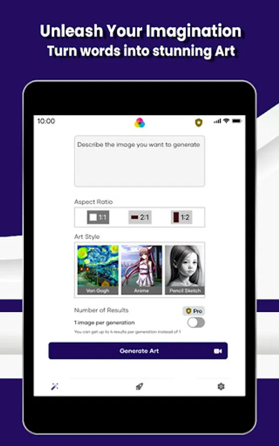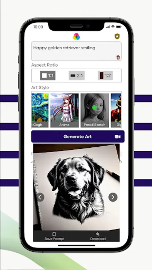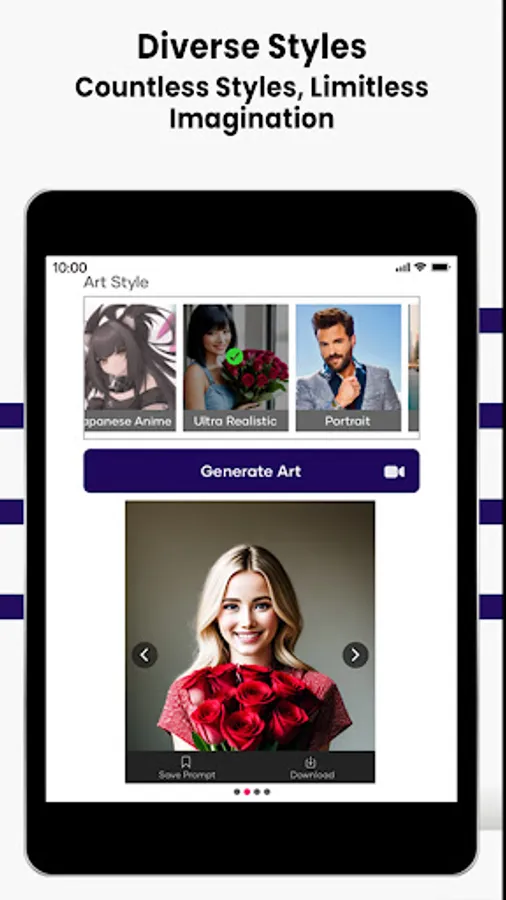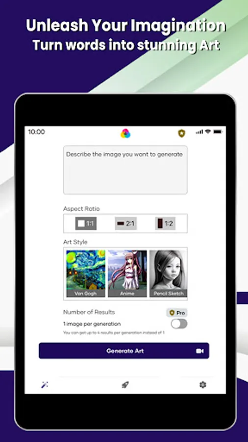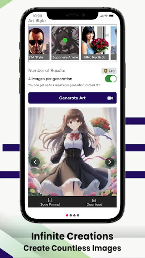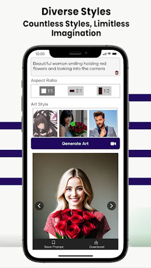 Launch the app and enter a prompt that describes the concept or theme you have in mind. It could be anything from "majestic landscapes" to "dreamy abstracts" or "fantastical creatures." ArtiVision's powerful AI algorithm analyzes your input and generates mesmerizing, high-quality images that will captivate your senses.