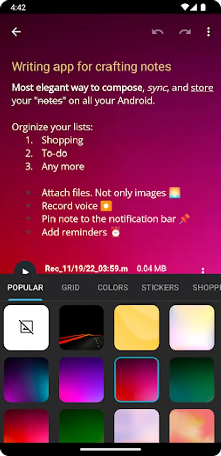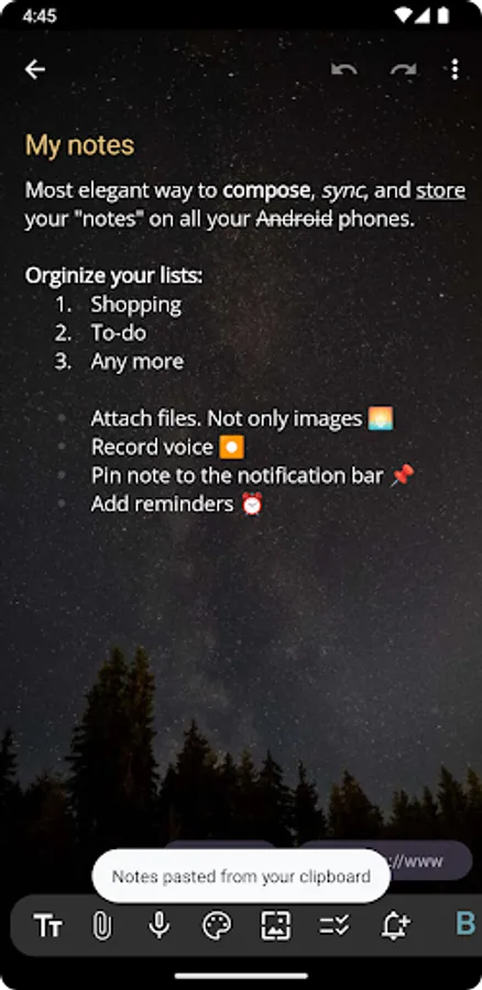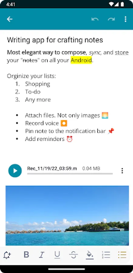 • Rich Editor: Customize your notes with a wide range of editing options, including bold, italic, strike-through, background color, different font sizes, and the ability to create lists