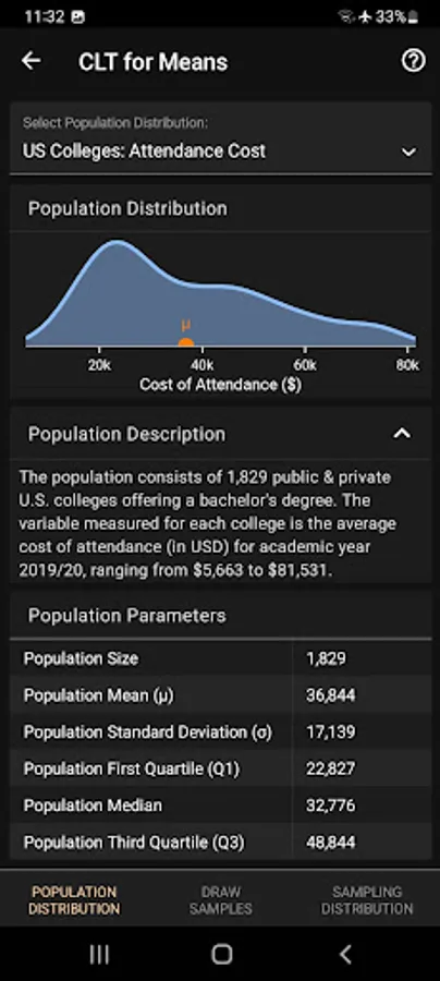 CLT: Select from several real population distributions (left and right-skewed or fairly symmetric) and simulate taking a sample from the population.