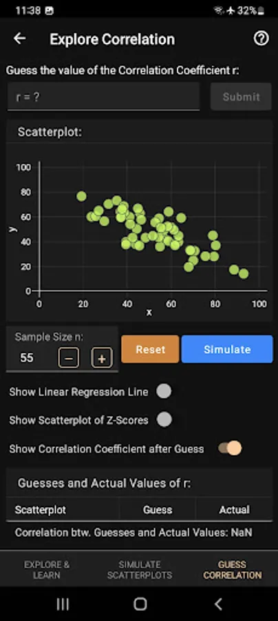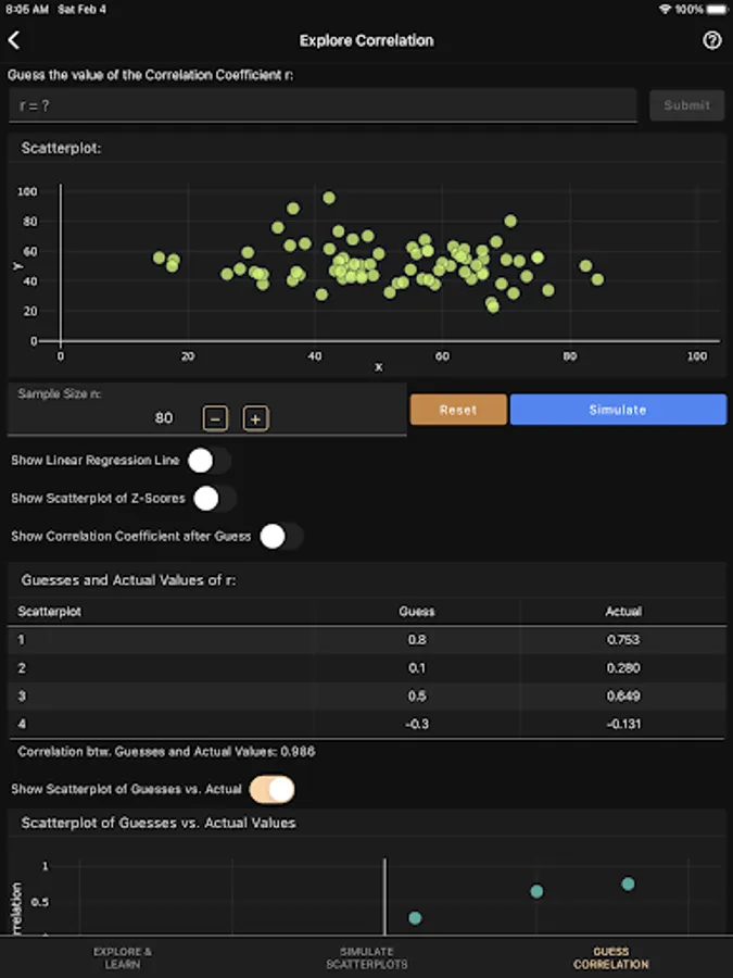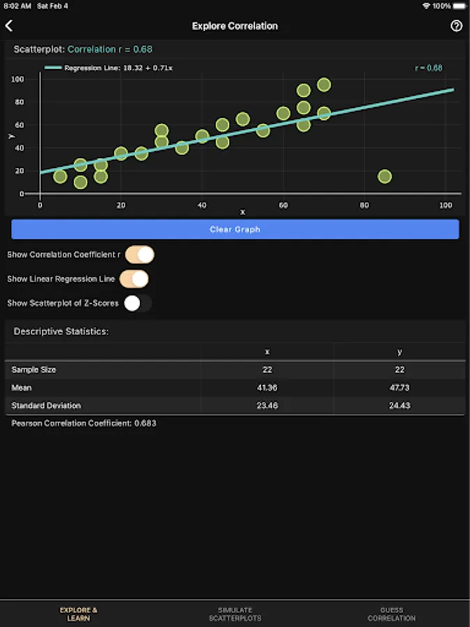 Explore Correlation/Linear Regression: Create (and delete) points in a scatterplot by tabbing on the screen. Show the regression line or residuals. Simulate scatterplots and guess the correlation coefficient.