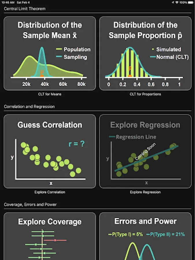 Explore the Central Limit Theorem, learn about the correlation coefficient and linear regression, and visualize the coverage probability of confidence intervals or Type I & II Errors in hypothesis testing.