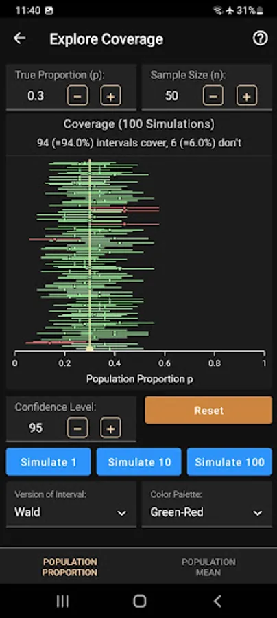 Coverage and Errors: Explore what 95% coverage for a confidence interval for a population mean or proportion implies.