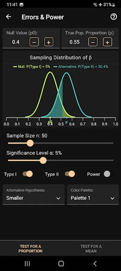 See the Type I and Type II error and explore how they depend on the sample size and the true parameter value. Find and visualize the power of a hypothesis test.